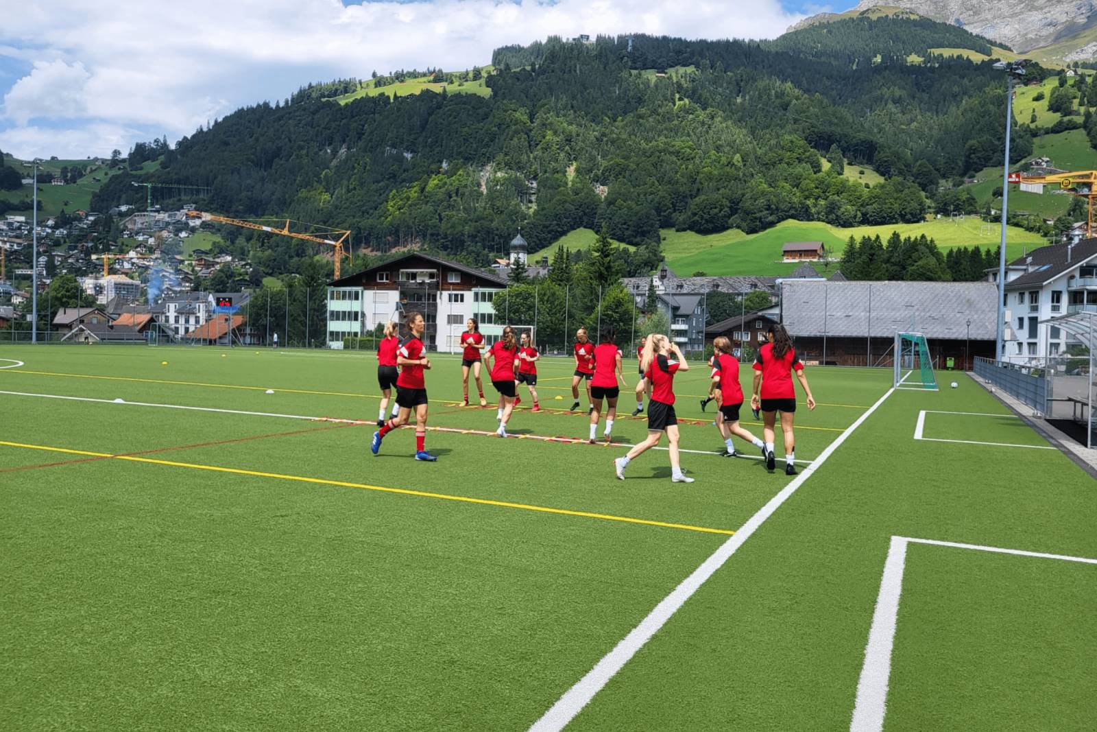 Der Wecker klingelt früh! Die Mädchen sind schon um 7.30 Uhr beim Frühstück. Das Frühstück wird auch in Buffetform serviert und es gibt sehr viel Auswahl: Brot, Butter und verschiedene Marmeladen, verschiedene Müslis, Milch und Joghurt, Käse und Aufschnitt, Obst und natürlich Kaffee, um gut aufzuwachen. Um 9 Uhr steht das Team auf dem Fussballplatz bereit für die zweite Trainingseinheit, die bis 10.30 Uhr dauern wird. Das Wetter ist glücklicherweise noch gut, aber leider ist die Vorhersage für den Nachmittag etwas schlechter. Nach einer schönen Dusche in der Jugendherberge geniesst das Team einen guten Teller Ravioli im Restaurant des Sporting Park Engelberg. Die Jugendherberge bietet nämlich kein Mittagessen an, dafür aber das Sportzentrum. Es gibt leckere Menüs zu einem guten Preis.